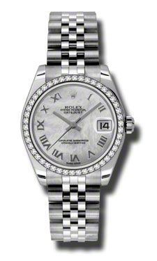 Model: 178384-MOPRJ - CASE = [Material:Stainless Steel], [Case Diameter:31], [Bezel:Fixed 18kt White Gold Bezel Set with Diamonds], [Case Back:Solid], [Water Resistant:100 Meters - 330 Feet], [Crystal:Scratch Resistant Sapphire], DIAL = [Color:Mother of Pearl Roman Numeral], MOVEMENT = [Type:Automatic Self Winding], [Crown:Screw Down], BAND = [Clasp:Concealed Crown], [Type:Stainless Steel Jubilee], (Usually ships in 1 to 2 weeks.)
