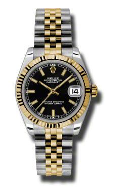 Model: 178273-BKSJ - CASE = [Material:Stainless Steel], [Case Diameter:31], [Bezel:Fluted], [Case Back:Solid], [Water Resistant:100 Meters - 330 Feet], [Crystal:Sapphire], DIAL = [Color:Black Index], MOVEMENT = [Type:Automatic Self Winding], [Crown:Screw Down], BAND = [Clasp:Concealed Crown], [Type:18kt Yellow Gold and Stainless Steel Jubilee], (Usually ships in 1 to 2 weeks.)