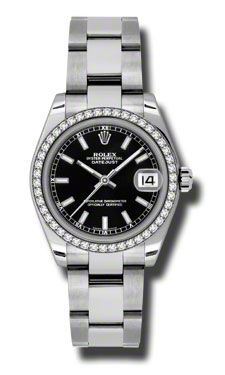 Model: 178384-BKSO - CASE = [Material:Stainless Steel], [Case Diameter:31], [Bezel:Fixed 18kt White Gold Bezel Set with 46 Diamonds], [Case Back:Solid], [Water Resistant:100 Meters - 330 Feet], [Crystal:Scratch Resistant Sapphire], DIAL = [Color:Black Stick], MOVEMENT = [Type:Automatic Self Winding], [Crown:Screw Down], BAND = [Clasp:Oysterlock Clasp], [Type:Stainless Steel Oyster], (Usually ships in 1 to 2 weeks.)