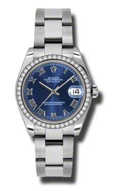 Model: 178384-BLRO - CASE = [Material:Stainless Steel], [Case Diameter:31], [Bezel:46 Diamonds set on 18K White Gold Domed], [Case Back:Solid], [Water Resistant:100 Meters - 330 Feet], [Crystal:Scratch Resistant Sapphire], DIAL = [Color:Date at 3, Roman Numerals on Blue], MOVEMENT = [Type:Self Winding Swiss Chronometer], [Crown:Screw Down], BAND = [Clasp:Oysterclasp], [Type:Oyster], (Usually ships in 2 to 4 business days.)