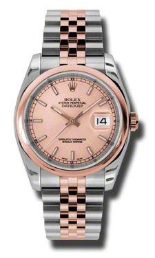 Model: 116201-PISJ - CASE = [Material:Stainless Steel], [Case Diameter:36], [Bezel:Domed 18kt Pink Gold], [Case Back:Solid], [Water Resistant:100 Meters - 330 Feet], [Crystal:Scratch Resistant Sapphire], DIAL = [Color:Pink Index], MOVEMENT = [Type:Automatic Self Winding], [Crown:Screw Down], BAND = [Clasp:Concealed Crown], [Type:Stainless Steel With 18kt Pink Gold Jubilee], (Usually ships in 1 to 2 weeks.)