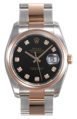 Model: 116201-BKDO - CASE = [Material:18kt Rose Gold and Stainless Steel], [Case Diameter:36], [Bezel:Fixed Domed], [Water Resistant:100 Meters - 330 Feet], [Crystal:Sapphire], DIAL = [Color:Black Diamond], MOVEMENT = [Type:31 Jewels Automatic Self Winding], BAND = [Clasp:Deployant], [Type:18kt Rose Gold and Stainless Steel], (Usually ships in 1 to 2 weeks.)