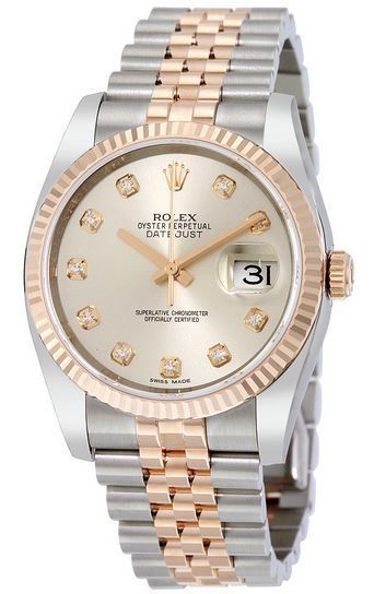 Model: 116231-0099 - CASE = [Material:Stainless Steel], [Case Diameter:36], [Bezel:Fluted 18kt Rose Gold], [Water Resistant:100 Meters - 330 Feet], [Crystal:Sapphire], DIAL = [Color:Silver with Diamonds and Date at 3], MOVEMENT = [Type:Automatic Self Winding], BAND = [Clasp:Concealed Crown], [Type:Two Tone Jubilee], (Usually ships in 1 to 2 weeks.)