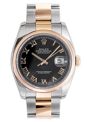 Model: 116201-BKRO - CASE = [Material:18kt Rose Gold and Stainless Steel], [Case Diameter:36], [Bezel:Fixed Domed], [Water Resistant:100 Meters - 330 Feet], [Crystal:Sapphire], DIAL = [Color:Black Roman Numeral], MOVEMENT = [Type:31 Jewels Automatic Self Winding], BAND = [Type:18kt Rose Gold and Stainless Steel], (Usually ships in 1 to 2 weeks.)