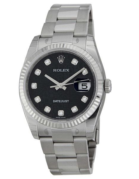 Model: 116234-BKJDO - CASE = [Material:Stainless Steel], [Case Diameter:36], [Bezel:Fluted 18kt White Gold], [Water Resistant:100 Meters - 330 Feet], [Crystal:Sapphire],; DIAL = [Color:Black Jubilee Diamond],; MOVEMENT = [Type:Automatic Self Winding],; BAND = [Clasp:Deployant Clasp], [Type:Stainless Steel Oyster], (Usually ships in 1 to 2 weeks.)