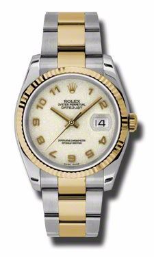 Model: 116233-IVAO - CASE = [Material:Stainless Steel and 18kt Yellow Gold], [Case Diameter:36], [Bezel:Fluted], [Case Back:Solid], [Water Resistant:100 Meters - 330 Feet], [Crystal:Sapphire],; DIAL = [Color:Ivory Pyramid Arabic],; MOVEMENT = [Type:Automatic Self Winding], [Crown:Screw Down],; BAND = [Clasp:Oysterlock Clasp], [Type:Stainless Steel and 18kt Yellow Gold], (Usually ships in 1 to 2 weeks.)