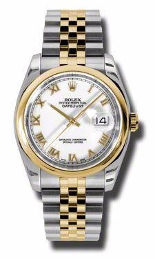 Model: 116203-WHRJ - CASE = [Material:Stainless Steel and 18K Yellow Gold], [Case Diameter:36], [Bezel:Domed], [Water Resistant:100 Meters - 330 Feet], [Crystal:Sapphire],; DIAL = [Color:White Roman Numeral],; MOVEMENT = [Type:Automatic Self Winding], [Crown:Screw Down],; BAND = [Clasp:Concealed Crown], [Type:Stainless Steel With 18kt Yellow Gold], (Usually ships in 1 to 2 weeks.)