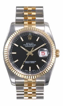 Model: 116233-BKSJ - CASE = [Material:Stainless Steel], [Case Diameter:36], [Bezel:Fixed Fluted], [Water Resistant:100 Meters - 330 Feet], [Crystal:Sapphire],; DIAL = [Color:Black Index],; MOVEMENT = [Type:31 Jewels Automatic Self Winding],; BAND = [Clasp:Hidden Deployant], [Type:18kt Yellow Gold and Stainless Steel Jubilee], (Usually ships in 1 to 2 weeks.)