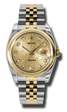 Model: 116203-CHJDJ - CASE = [Material:Stainless Steel and 18kt Yellow Gold], [Case Diameter:36], [Bezel:Domed], [Water Resistant:100 Meters - 330 Feet], [Crystal:Sapphire],; DIAL = [Color:Champagne Jubilee Diamond],; MOVEMENT = [Type:Automatic Self Winding], [Crown:Screw Down],; BAND = [Clasp:Concealed Crown], [Type:Stainless Steel With 18kt Yellow Gold], (Usually ships in 1 to 2 weeks.)