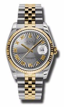 Model: 116233-GRYRJ - CASE = [Material:Stainless Steel and 18K Yellow Gold], [Case Diameter:36], [Bezel:Fluted], [Case Back:Solid], [Water Resistant:100 Meters - 330 Feet], [Crystal:Sapphire],; DIAL = [Color:Grey Roman Numeral],; MOVEMENT = [Type:Automatic Self Winding], [Crown:Screw Down],; BAND = [Clasp:Concealed Crown], [Type:Stainless Steel With 18kt Yellow Gold], (Usually ships in 1 to 2 weeks.)