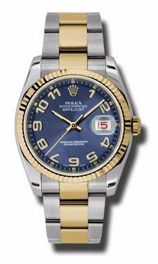 Model: 116233-BLCRO - CASE = [Material:Stainless Steel and 18kt Yellow Gold], [Case Diameter:36], [Bezel:Fluted], [Case Back:Solid], [Water Resistant:100 Meters - 330 Feet], [Crystal:Sapphire],; DIAL = [Color:Blue Concentric Roman Numeral],; MOVEMENT = [Type:Automatic Self Winding], [Crown:Screw Down],; BAND = [Clasp:Oysterlock Clasp], [Type:Stainless Steel and 18kt Yellow Gold], (Usually ships in 1 to 2 weeks.)