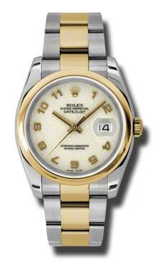 Model: 116203-IVAO - CASE = [Material:Stainless Steel and 18K Yellow Gold], [Case Diameter:36], [Bezel:Domed], [Water Resistant:100 Meters - 330 Feet], [Crystal:Sapphire],; DIAL = [Color:Ivory Jubilee Arabic],; MOVEMENT = [Type:Automatic Self Winding], [Crown:Screw Down],; BAND = [Clasp:Oysterlock Clasp], [Type:Stainless Steel With 18kt Yellow Gold], (Usually ships in 1 to 2 weeks.)