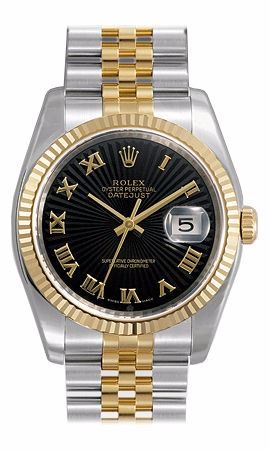 Model: 116233-BKSRJ - CASE = [Material:Stainless Steel], [Case Diameter:36], [Bezel:Fixed Fluted], [Water Resistant:100 Meters - 330 Feet], [Crystal:Sapphire],; DIAL = [Color:Black Sunburst Roman Numeral],; MOVEMENT = [Type:31 Jewels Automatic Self Winding],; BAND = [Clasp:Hidden Deployant], [Type:18kt Yellow Gold and Stainless Steel Jubilee], (Usually ships in 1 to 2 weeks.)