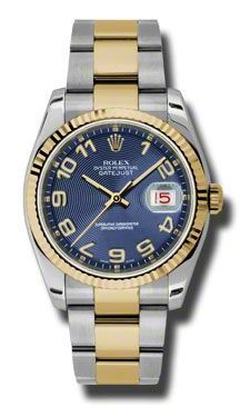 Model: 116233-BLCAO - CASE = [Material:Stainless Steel and 18kt Yellow Gold], [Case Diameter:36], [Bezel:Fluted], [Case Back:Solid], [Water Resistant:100 Meters - 330 Feet], [Crystal:Sapphire],; DIAL = [Color:Blue Concentric Roman Numeral],; MOVEMENT = [Type:Automatic Self Winding], [Crown:Screw Down],; BAND = [Clasp:Oysterlock Clasp], [Type:Stainless Steel and 18kt Yellow Gold], (Usually ships in 1 to 2 weeks.)