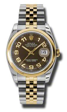Model: 116203-BRAJ - CASE = [Material:Stainless Steel and 18K Yellow Gold], [Case Diameter:36], [Bezel:Domed], [Water Resistant:100 Meters - 330 Feet], [Crystal:Sapphire], DIAL = [Color:Brown Arabic], MOVEMENT = [Type:Automatic Self Winding], [Crown:Screw Down], BAND = [Clasp:Concealed Crown], [Type:Stainless Steel With 18kt Yellow Gold], (Usually ships in 1 to 2 weeks.)