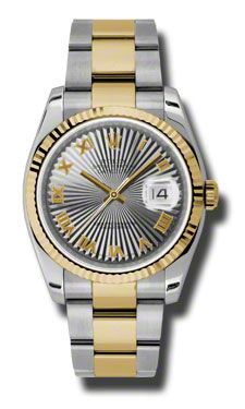 Model: 116233-GRYRO - CASE = [Material:Stainless Steel and 18kt Yellow Gold], [Case Diameter:36], [Bezel:Fluted], [Case Back:Solid], [Water Resistant:100 Meters - 330 Feet], [Crystal:Sapphire], DIAL = [Color:Grey Roman Numeral], MOVEMENT = [Type:Automatic Self Winding], [Crown:Screw Down], BAND = [Clasp:Oysterlock Clasp], [Type:Stainless Steel and 18kt Yellow Gold], (Usually ships in 1 to 2 weeks.)