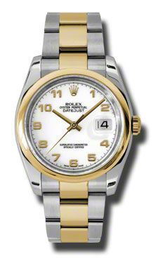 Model: 116203-WHAO - CASE = [Material:Stainless Steel and 18K Yellow Gold], [Case Diameter:36], [Bezel:Domed], [Water Resistant:100 Meters - 330 Feet], [Crystal:Sapphire], DIAL = [Color:White Arabic], MOVEMENT = [Type:Automatic Self Winding], [Crown:Screw Down], BAND = [Clasp:Oysterlock Clasp], [Type:Stainless Steel With 18kt Yellow Gold], (Usually ships in 1 to 2 weeks.)