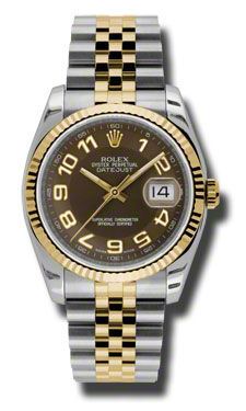 Model: 116233-BRAJ - CASE = [Material:Stainless Steel and 18K Yellow Gold], [Case Diameter:36], [Bezel:Fluted], [Water Resistant:100 Meters - 330 Feet], [Crystal:Sapphire], DIAL = [Color:Brown Arabic], MOVEMENT = [Type:Automatic Self Winding], [Crown:Screw Down], BAND = [Clasp:Concealed Crown], [Type:Stainless Steel With 18kt Yellow Gold], (Usually ships in 1 to 2 weeks.)