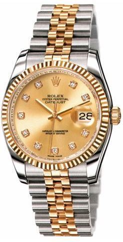 Model: 116233-CHDJ - CASE = [Material:Stainless Steel], [Case Diameter:36], [Bezel:Fixed Fluted], [Water Resistant:100 Meters - 330 Feet], [Crystal:Sapphire], DIAL = [Color:Champagne Diamond], MOVEMENT = [Type:31 Jewels Automatic Self Winding], BAND = [Clasp:Hidden Deployant], [Type:18kt Yellow Gold and Stainless Steel Jubilee], (In Stock - Ready to ship.)
