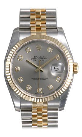 Model: 116233-GRYDJ - CASE = [Material:Stainless Steel], [Case Diameter:36], [Bezel:Fixed Fluted], [Water Resistant:100 Meters - 330 Feet], [Crystal:Sapphire], DIAL = [Color:Grey Diamond], MOVEMENT = [Type:31 Jewels Automatic Self Winding], BAND = [Clasp:Hidden Deployant], [Type:18kt Yellow Gold and Stainless Steel Jubilee], (Usually ships in 1 to 2 weeks.)
