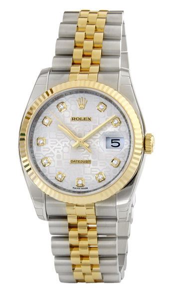 Model: 116233-SIJDJ - CASE = [Material:Stainless Steel], [Case Diameter:36], [Bezel:Fixed Fluted], [Water Resistant:100 Meters - 330 Feet], [Crystal:Sapphire], DIAL = [Color:Silver Jubilee Diamond], MOVEMENT = [Type:31 Jewels Automatic Self Winding], BAND = [Clasp:Deployant], [Type:18kt Yellow Gold and Stainless Steel Jubilee], (Usually ships in 1 to 2 weeks.)