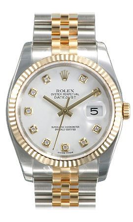 Model: 116233-WHDJ - CASE = [Material:Stainless Steel], [Case Diameter:36], [Bezel:Fixed Fluted], [Water Resistant:100 Meters - 330 Feet], [Crystal:Sapphire], DIAL = [Color:White Diamond], MOVEMENT = [Type:31 Jewels Automatic Self Winding], BAND = [Clasp:Hidden Deployant], [Type:18kt Yellow Gold and Stainless Steel Jubilee], (Usually ships in 1 to 2 weeks.)