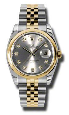 Model: 116203-GRYDJ - CASE = [Material:Stainless Steel and 18kt Yellow Gold], [Case Diameter:36], [Bezel:Domed], [Water Resistant:100 Meters - 330 Feet], [Crystal:Sapphire], DIAL = [Color:Grey Diamond], MOVEMENT = [Type:Automatic Self Winding], [Crown:Screw Down], BAND = [Clasp:Concealed Crown], [Type:Stainless Steel With 18kt Yellow Gold], (Usually ships in 1 to 2 weeks.)