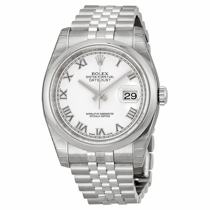 Model: 116200-WHRJ - Case,; MATERIALSTAINLESS STEEL = [Case Diameter36], [BezelFixed Domed Stainless Steel], [Water Resistant100 Meters - 330 Feet], [CrystalSapphire], Dial,; COLORWHITE ROMAN NUMERAL = Movement,; TYPE31 JEWELS AUTOMATIC SELF WINDING = Band,; CLASPHIDDEN DEPLOYANT = [TypeStainless Steel Jubilee], (Usually ships in 1 to 2 weeks.)