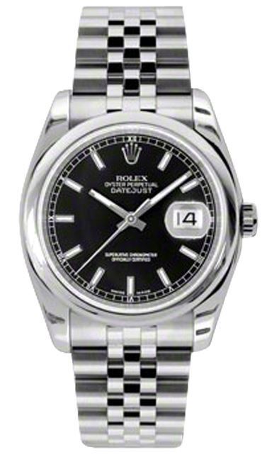 Model: 116200-BKSJ - CASE = [Material:Stainless Steel], [Case Diameter:36], [Bezel:Fixed Domed], [Water Resistant:100 Meters - 330 Feet], [Crystal:Sapphire], DIAL = [Color:Black Stick], MOVEMENT = [Type:31 Jewels Automatic Self Winding], [Crown:Screw Down], BAND = [Clasp:Concealed Crown], [Type:Stainless steel Jubilee], (Usually ships in 1 to 2 weeks.)
