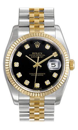 Model: 116233-BKDJ - CASE = [Material:Stainless Steel], [Case Diameter:36], [Bezel:Fixed Fluted], [Water Resistant:100 Meters - 330 Feet], [Crystal:Sapphire], DIAL = [Color:Black Diamond], MOVEMENT = [Type:31 Jewels Automatic Self Winding], BAND = [Clasp:Hidden Deployant], [Type:18kt Yellow Gold and Stainless Steel Jubilee], (Usually ships in 1 to 2 weeks.)