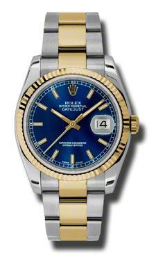 Model: 116233-BLSO - CASE = [Material:Stainless Steel and 18kt Yellow Gold], [Case Diameter:36], [Bezel:Fluted], [Case Back:Solid], [Water Resistant:100 Meters - 330 Feet], [Crystal:Sapphire], DIAL = [Color:Blue Index], MOVEMENT = [Type:Automatic Self Winding], [Crown:Screw Down], BAND = [Clasp:Oysterlock Clasp], [Type:18kt Yellow Gold and Stainless Steel], (Usually ships in 1 to 2 weeks.)