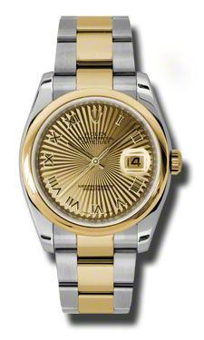 Model: 116203-CHRO - CASE = [Material:Stainless Steel and 18K Yellow Gold], [Case Diameter:36], [Bezel:Domed], [Water Resistant:100 Meters - 330 Feet], [Crystal:Sapphire], DIAL = [Color:Champagne Roman Numeral], MOVEMENT = [Type:Automatic Self Winding], [Crown:Screw Down], BAND = [Clasp:Oysterlock Clasp], [Type:Stainless Steel With 18kt Yellow Gold], (Usually ships in 1 to 2 weeks.)