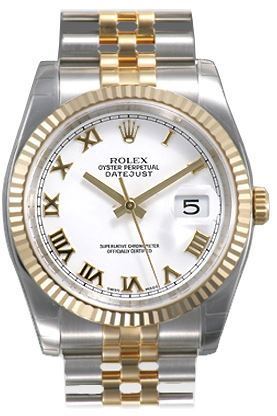 Model: 116233-IVRJ - CASE = [Material:Stainless Steel], [Case Diameter:36], [Bezel:Fluted Fixed], [Water Resistant:100 Meters - 330 Feet], [Crystal:Synthetic Sapphire], DIAL = [Color:Ivory Roman Numeral], MOVEMENT = [Type:31 Jewels Automatic Self Winding], BAND = [Clasp:Hidden Deployant], [Type:18kt Yellow Gold and Stainless Steel Jubilee], (Usually ships in 1 to 2 weeks.)