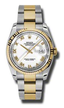 Model: 116233-WHRO - CASE = [Material:Stainless Steel and 18kt Yellow Gold], [Case Diameter:36], [Bezel:Fluted], [Case Back:Solid], [Water Resistant:100 Meters - 330 Feet], [Crystal:Sapphire], DIAL = [Color:White Roman Numeral], MOVEMENT = [Type:Automatic Self Winding], [Crown:Screw Down], BAND = [Clasp:Oysterlock Clasp], [Type:18kt Yellow Gold and Stainless Steel], (Usually ships in 1 to 2 weeks.)