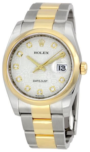 Model: 116203-SIJDO - CASE = [Material:Stainless Steelk], [Case Diameter:36], [Bezel:Fixed Domed], [Water Resistant:100 Meters - 330 Feet], [Crystal:Sapphire], DIAL = [Color:Silver Jubilee Diamond], MOVEMENT = [Type:Automatic Self Winding], BAND = [Type:Stainless Steel With 18kt Yellow Gold], (Usually ships in 1 to 2 weeks.)