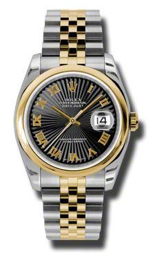 Model: 116203-BKSRJ - CASE = [Material:Stainless Steel and 18K Yellow Gold], [Case Diameter:36], [Bezel:Domed], [Water Resistant:100 Meters - 330 Feet], [Crystal:Sapphire], DIAL = [Color:Black Sunburst Roman Numeral], MOVEMENT = [Type:Automatic Self Winding], [Crown:Screw Down], BAND = [Clasp:Concealed Crown], [Type:Stainless Steel With 18kt Yellow Gold],  (Usually ships in 1 to 2 weeks.)