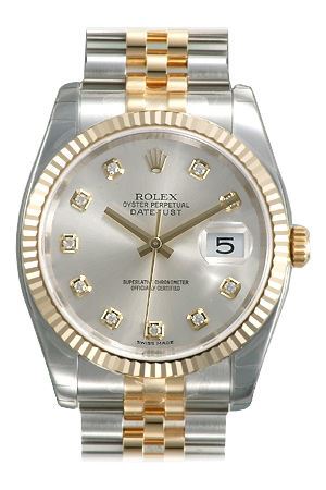 Model: 116233-SIDJ - CASE = [Material:Stainless Steel], [Case Diameter:36], [Bezel:Fixed Fluted], [Water Resistant:100 Meters - 330 Feet], [Crystal:Sapphire], DIAL = [Color:Silver Diamond], MOVEMENT = [Type:31 Jewels Automatic Self Winding], BAND = [Clasp:Hidden Deployant], [Type:18kt Yellow Gold and Stainless Steel Jubilee], (Usually ships in 1 to 2 weeks.)