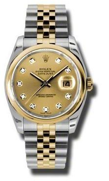 Model: 116203-CHDJ - CASE = [Material:Stainless Steel and 18kt Yellow Gold], [Case Diameter:36], [Bezel:Domed], [Water Resistant:100 Meters - 330 Feet], [Crystal:Sapphire], DIAL = [Color:Champagne Diamond], MOVEMENT = [Type:Automatic Self Winding], [Crown:Screw Down], BAND = [Clasp:Concealed Crown], [Type:Stainless Steel With 18kt Yellow Gold], (Usually ships in 1 to 2 weeks.)