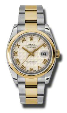 Model: 116203-IVRO - CASE = [Material:Stainless Steel and 18K Yellow Gold], [Case Diameter:36], [Bezel:Domed], [Water Resistant:100 Meters - 330 Feet], [Crystal:Sapphire], DIAL = [Color:Ivory Pyramid Roman Numeral], MOVEMENT = [Type:Automatic Self Winding], [Crown:Screw Down], BAND = [Clasp:Oysterlock Clasp], [Type:Stainless Steel With 18kt Yellow Gold], (Usually ships in 1 to 2 weeks.)