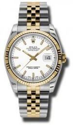 Model: 116233-WHSJ - CASE = [Material:Stainless Steel], [Case Diameter:36], [Bezel:Fixed Fluted 18kt Yellow Gold], [Case Back:Solid], [Water Resistant:100 Meters - 330 Feet], [Crystal:Synthetic Sapphire], DIAL = [Color:White Index], MOVEMENT = [Type:31 Jewels Automatic Self Winding], BAND = [Clasp:Hidden Deployant], [Type:18kt Yellow Gold and Stainless Steel Jubilee], (Usually ships in 1 to 2 weeks.)
