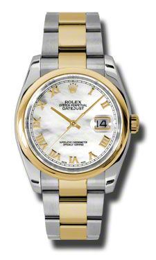 Model: 116203-MOPRO - CASE = [Material:Stainless Steel and 18K Yellow Gold], [Case Diameter:36], [Bezel:Domed], [Water Resistant:100 Meters - 330 Feet], [Crystal:Sapphire], DIAL = [Color:Mother of Pearl Roman Numeral], MOVEMENT = [Type:Automatic Self Winding], [Crown:Screw Down], BAND = [Clasp:Oysterlock Clasp], [Type:Stainless Steel With 18kt Yellow Gold], (Usually ships in 1 to 2 weeks.)