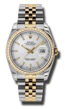 Model: 116243-SISJ - CASE = [Material:Stainless Steel and 18kt Yellow Gold], [Case Diameter:36], [Bezel:Diamond], [Case Back:Solid], [Water Resistant:100 Meters - 330 Feet], [Crystal:Sapphire], DIAL = [Color:Silver Index], MOVEMENT = [Type:Automatic Self Winding], [Crown:Screw Down], BAND = [Clasp:Concealed Crown], [Type:Stainless Steel and 18kt Yellow Gold], (Usually ships in 1 to 2 weeks.)