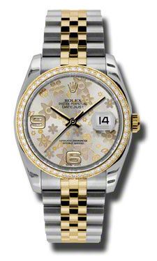 Model: 116243-SIFLAJ - CASE = [Material:Stainless Steel and 18kt Yellow Gold], [Case Diameter:36], [Bezel:Diamond], [Case Back:Solid], [Water Resistant:100 Meters - 330 Feet], [Crystal:Sapphire], DIAL = [Color:Silver Floral Arabic], MOVEMENT = [Type:Automatic Self Winding], [Crown:Screw Down], BAND = [Clasp:Concealed Crown], [Type:Stainless Steel and 18kt Yellow Gold], (Usually ships in 1 to 2 weeks.)