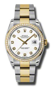 Model: 116243-WHDO - CASE = [Material:Stainless Steel and 18kt Yellow Gold], [Case Diameter:36], [Bezel:Diamond], [Case Back:Solid], [Water Resistant:100 Meters - 330 Feet], [Crystal:Sapphire], DIAL = [Color:White Diamond], MOVEMENT = [Type:Automatic Self Winding], [Crown:Screw Down], BAND = [Clasp:Oysterlock Clasp], [Type:Stainless Steel and 18kt Yellow Gold], (Usually ships in 1 to 2 weeks.)