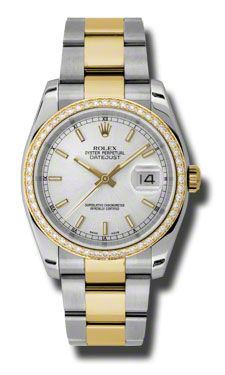 Model: 116243-SISO - CASE = [Material:Stainless Steel and 18kt Yellow Gold], [Case Diameter:36], [Bezel:Diamond], [Case Back:Solid], [Water Resistant:100 Meters - 330 Feet], [Crystal:Sapphire], DIAL = [Color:Silver Index], MOVEMENT = [Type:Automatic Self Winding], [Crown:Screw Down], BAND = [Clasp:Oysterlock Clasp], [Type:Stainless Steel and 18kt Yellow Gold], (Usually ships in 1 to 2 weeks.)