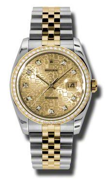 Model: 116243-CHJDJ - CASE = [Material:Stainless Steel and 18kt Yellow Gold], [Case Diameter:36], [Bezel:Diamond], [Case Back:Solid], [Water Resistant:100 Meters - 330 Feet], [Crystal:Sapphire], DIAL = [Color:Champagne Jubilee Diamond], MOVEMENT = [Type:Automatic Self Winding], [Crown:Screw Down], BAND = [Clasp:Concealed Crown], [Type:Stainless Steel and 18kt Yellow Gold], (Usually ships in 1 to 2 weeks.)