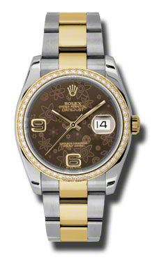 Model: 116243-BRFLAO - CASE = [Material:Stainless Steel and 18kt Yellow Gold], [Case Diameter:36], [Bezel:Diamond], [Case Back:Solid], [Water Resistant:100 Meters - 330 Feet], [Crystal:Sapphire], DIAL = [Color:Brown Floral Arabic], MOVEMENT = [Type:Automatic Self Winding], [Crown:Screw Down], BAND = [Clasp:Oysterlock Clasp], [Type:Stainless Steel and 18kt Yellow Gold], (Usually ships in 1 to 2 weeks.)