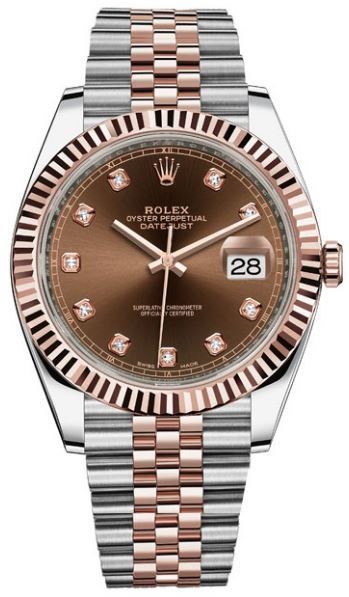 Model: M126331-0004 - CASE = [Material:Stainless Steel with 18kt Rose Gold], [Case Diameter:41], [Bezel:Fluted], [Case Back:Solid], [Water Resistant:100 Meters - 330 Feet], [Crystal:Scratch Resistant Sapphire], DIAL = [Color:Chocolate with Diamonds], MOVEMENT = [Type:Automatic], [Crown:Screw Down], BAND = [Clasp:Folding], [Type:Stainless Steel and 18kt Rose Gold], (Usually ships in 2 to 4 business days.)