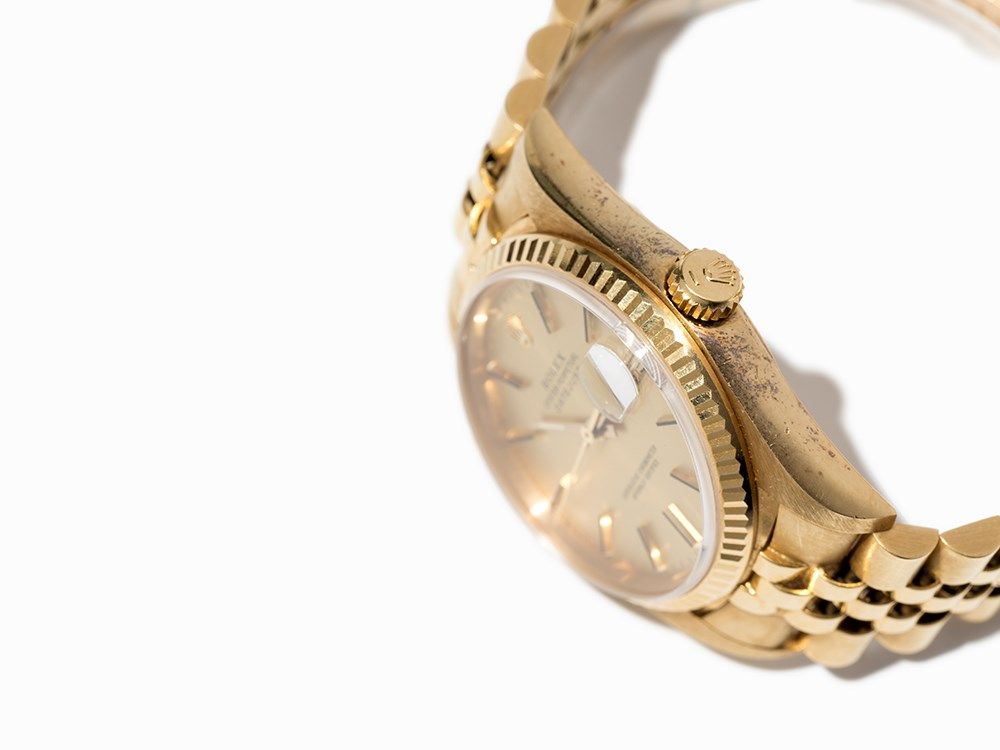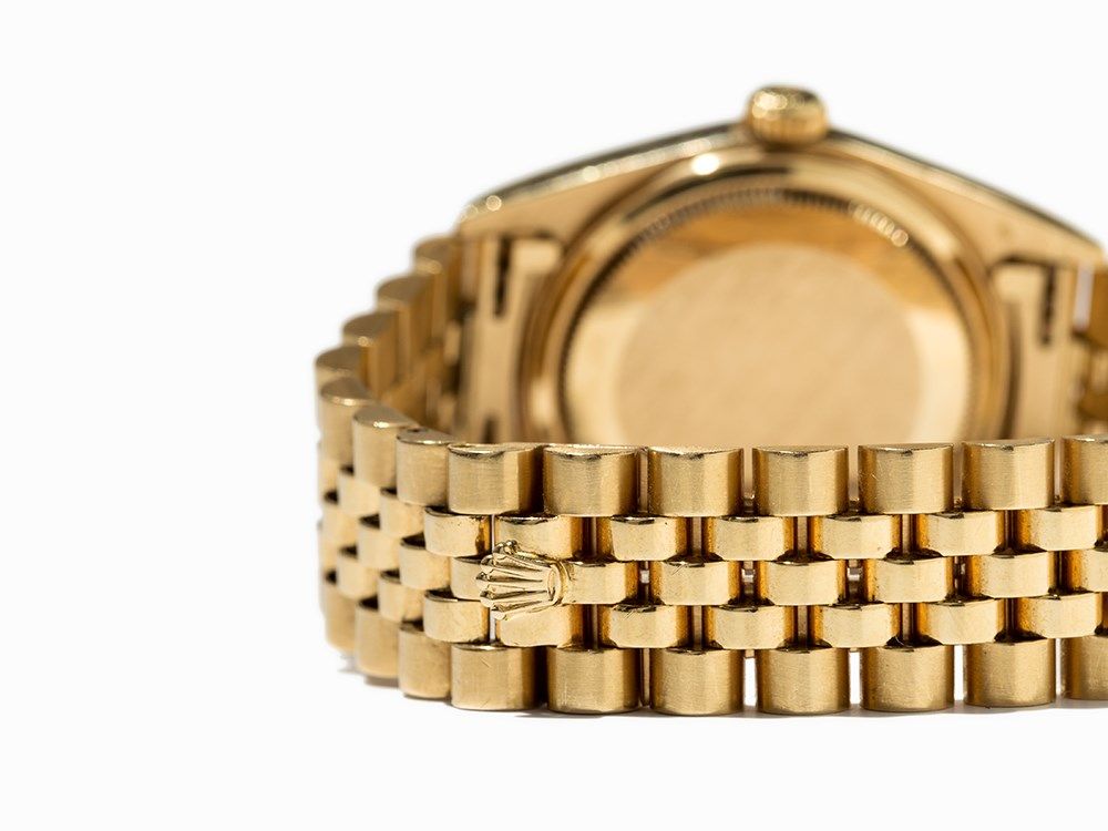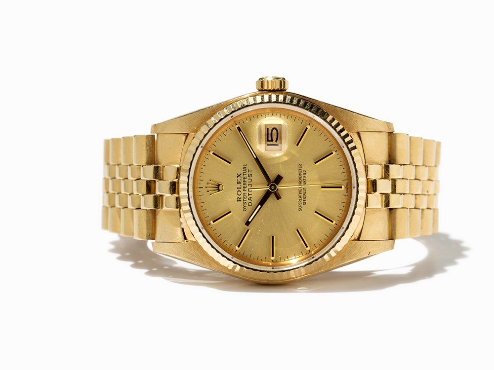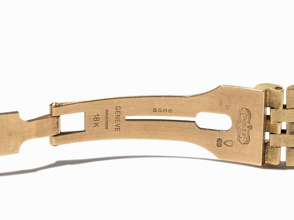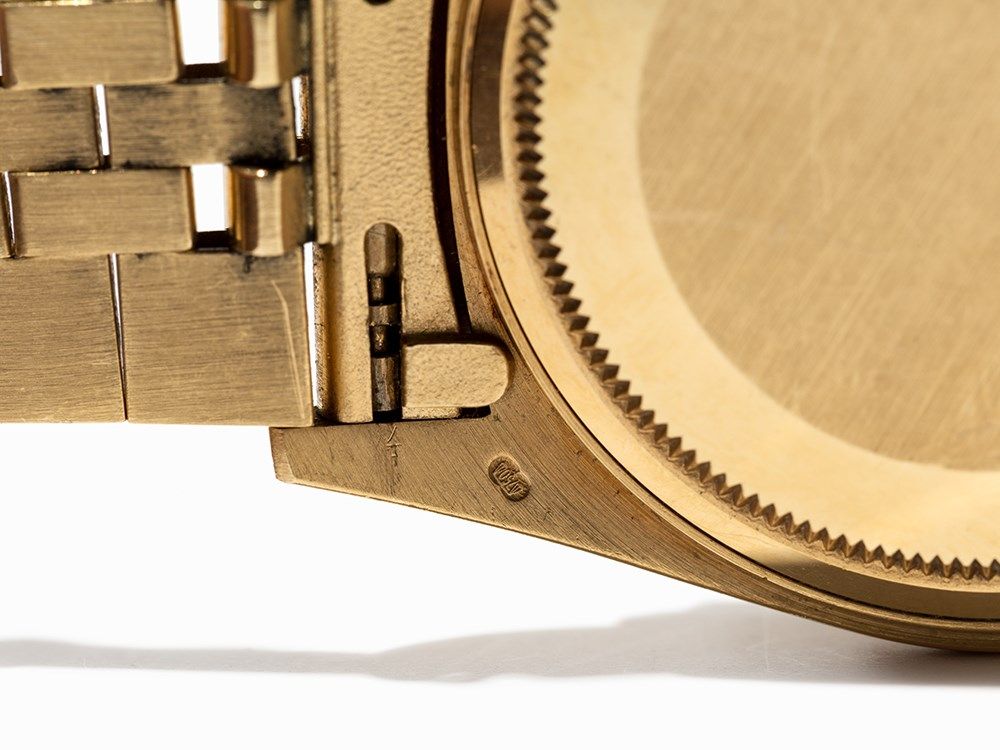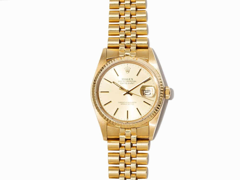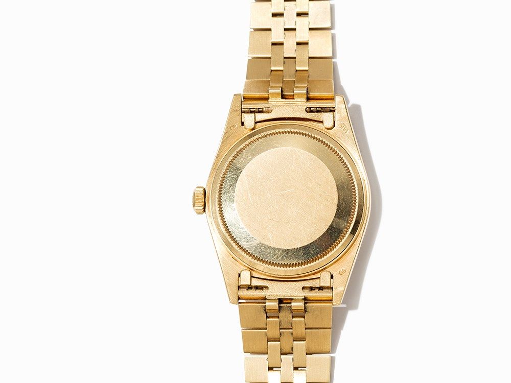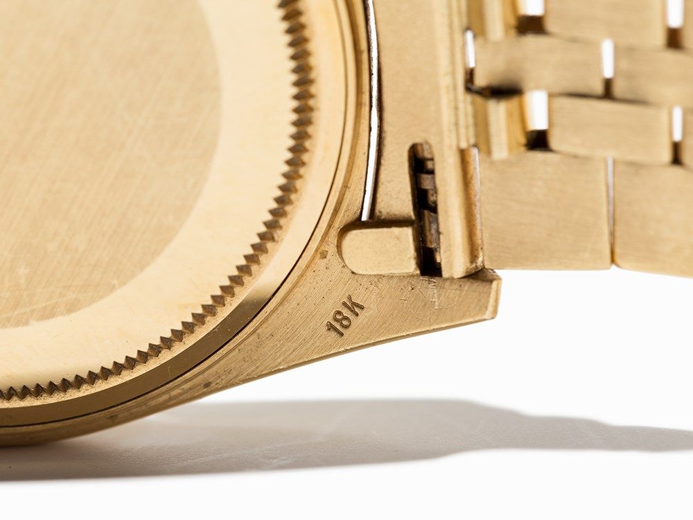 This Rolex Datejust chronometer wristwatch, ref. 16000/16013, was made in Switzerland around 1980. The watch is fitted with an automatic movement calibre 3035 with 27 jewels and displays hour, minute, second and date. The gold dial shows gold hands. Watch case, strap and folding clasp of 18K gold. The movement number is 1108844. Watch case cover and clasp are made of stainless steel.