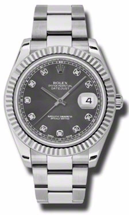 Model: 116334-RDO - CASE = [Material:Stainless Steel], [Case Diameter:41], [Bezel:Fluted 18K White Gold], [Case Back:Solid], [Water Resistant:100 Meters - 330 Feet], [Crystal:Sapphire],; DIAL = [Color:Rhodium with Diamond Markers],; MOVEMENT = [Type:Automatic Self Winding Rolex cAlibre 3187], [Crown:Screw Down],; BAND = [Clasp:Oyster Clasp], [Type:Stainless Steel Oyster], (Usually ships in 2 to 4 business days.)